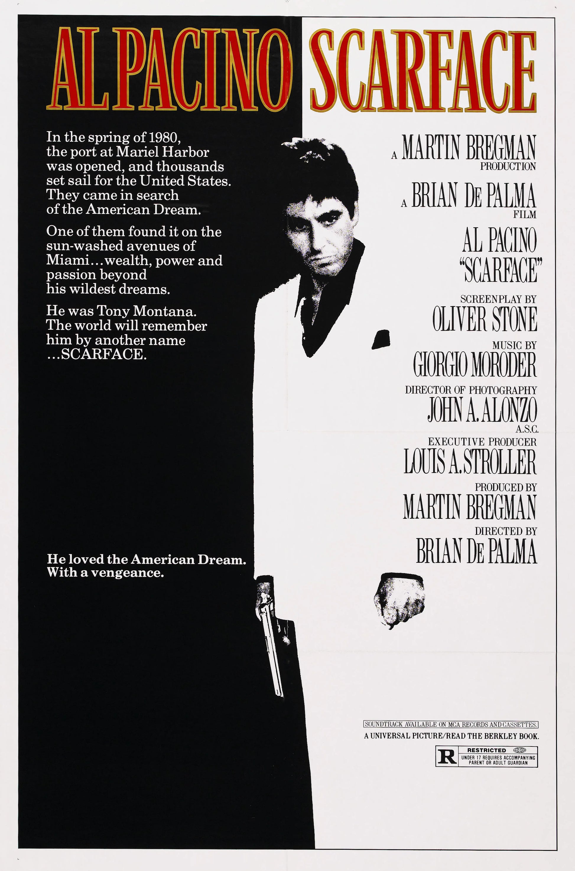 The Scarface poster is an iconic piece of art that captures the essence of the film directed by Brian De Palma and starring Al Pacino . In the center of the image, we see Tony Montana , played by Pacino, with an intense and determined look. His face reflects the strength and darkness of the character.